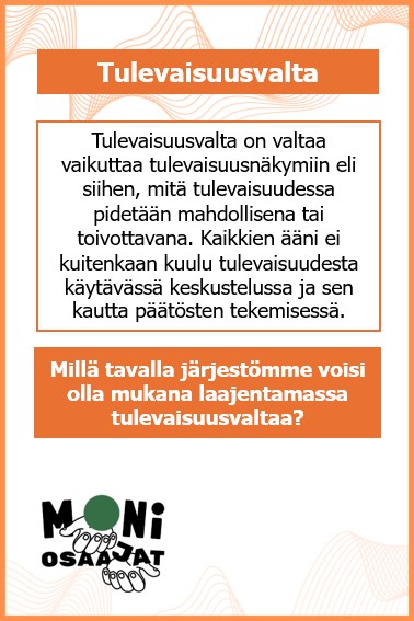 Moniosaajat-hanketiimi haluaa rohkaista järjestötoimijoita tulevaisuuden suunnitteluun ja nostamaan katsetta hivenen kauemmaksi horisonttiin. Työvälineiksi on kehitteillä tulevaisuuden trendikortit* (63 kpl) ja keskustelua tukeva lautapeli. Olemme saaneet valmiiksi testimateriaalit, jotka on lähetetty järjestöille koekäyttöön.