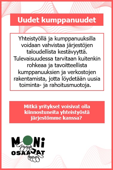 Toivomme, että järjestöt testaavat materiaaleja eri tavoin ideoinnin ja keskustelun tukena ryhmässä tai yksin esimerkiksi järjestön strategian työstämisessä, kehittämispäivän ohjelmassa, toimintasuunnitelman tekemisessä tai hallituksen kokouksessa. Haluamme muistuttaa järjestötoimijoita, että ideoinnissa kaikkien ideat ovat arvokkaita ja kynnys kannattaa pitää matalalla, jotta kaikkien osaaminen saadaan mukaan!