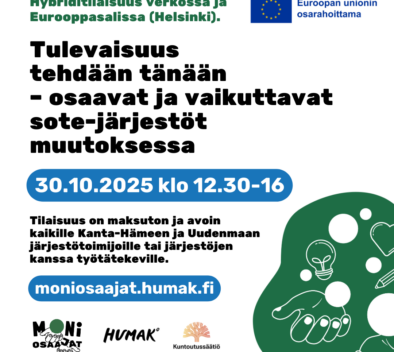 Tervetuloa Moniosaajat-hankkeen Tulevaisuus tehdään tänään – osaavat ja vaikuttavat sote-järjestöt muutoksessa -tilaisuuteen, 30.10.2025 klo...
